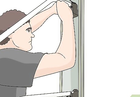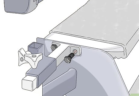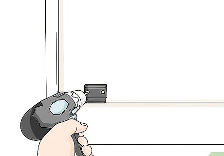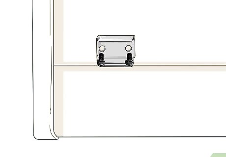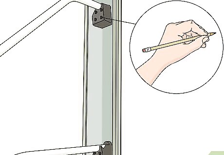 Drill a couple of ⁄4 in (0.64 cm)-wide holes through the bracket. Detach the leg from the bracket by sliding out the metal clip binding them together. Locate the holes, usually 2 of them, on the ends of the clip. You can use those holes to make the pilot holes without having to do any sort of measuring. Make the pilot holes about 2 in (5.1 cm) deep. Check the bracket to see if it has a sticky backing you can use to keep it in place while you’re drilling. If it doesn’t, hold onto it or have someone else do it for you. If you’re having trouble working with the bracket, mark the screw holes with pencil, remove the bracket, then drill the pilot holes.