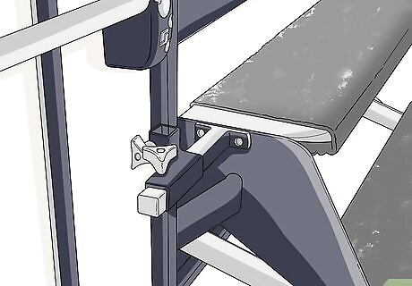 Place locking nuts on the ends of the screws if they are exposed. On side-mounted brackets, the screws will be exposed on the outer part of the steps. Fit a ⁄4 in (0.64 cm) locking nut onto each screw. These nuts are threaded like screws, so turn them clockwise by hand until they stay in place. Then, tighten them with a ratchet wrench or another tool. Front-mounted brackets usually will not require locking nuts. If the screws aren’t exposed, you won’t have to worry about adding the extra security.