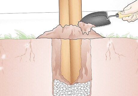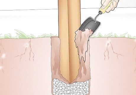 Build a mound at the bottom of the fence post. Mound dirt around the fence post at ground level, rounding it with a trowel, if you filled in around the post with soil. This will direct rain and snow melt away from the fence post, as well as help to secure the post in the ground. If you do use concrete, you still want to have a gentle slope away from the post. Fill it halfway with concrete and ensure that the post is still level when you install. Let the concrete cure properly, then fill the rest of the hole with dirt.