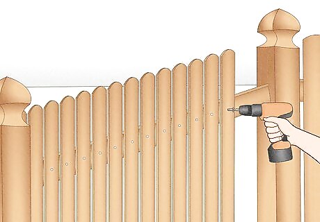 Connect the first two fence posts. Depending on what kind of fence you're installing, you might need to either install a cross-beam to provide yourself something to attach individual fence panels onto, or you might just set up the large piece of fence paneling and slot it into the fence posts. Each fence will be different, so you'll need to proceed according to your own plans for the fence if you're making your own, or following the directions of the fence kit you purchased. If you're cutting your own panels or fence slats, install cross-beams with wood-screws between each set of fence posts. You can either use a crossing "X" pattern, or flat beams parallel to the ground, depending on what you're going for. Cut fence panels of the appropriate height for your fence. If you're installing a pre-fab fence, most panels will be quite large, but you'll need to install a post between every panel, meaning that you might need to install more posts as you work. You can either install a post, attach the panel and support it while you dig the next post, or go around and install all the posts before you start inserting the panels. Brace recently installed posts during this process to ensure adequate panel support while the post fill cures or sets.