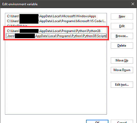 Add the Python path you just copied to the user 'Path' variable. You can do this by selecting the 'Path' variable, clicking Edit… → New and pasting the path. Paste it again in a new field with "\Scripts" at the end of it. You may need to restart your computer after this step. After following these steps, you will have a local Python installation with full pip functionality that you can use from a command shell.