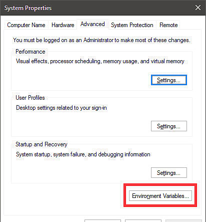 Open the Environment Variables dialog. This can be done by searching up "system variables" and clicking on the first option, then clicking on the Environment Variables… button.