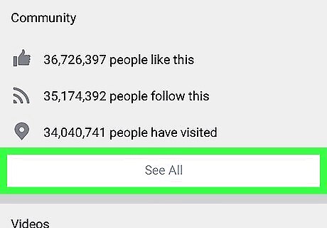 Scroll down to the "Community" section and tap See All. Here, you can see a summary of everybody who likes and/or follows this page. Tapping See All will take you to the Community tab with more info about the total likes and follows the page has accrued. Alternatively, you can swipe left on the tabs panel at the top of this page's Home screen, and tap on the Community tab.