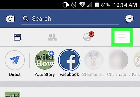 Tap the Menu button. This button looks like three horizontal lines next to the Notifications button in the upper-right corner of your screen. If Facebook opens up to a profile page, you will not see the Menu button on your screen. In this case, tap the back button to go back to your News Feed, and then tap the Menu button.