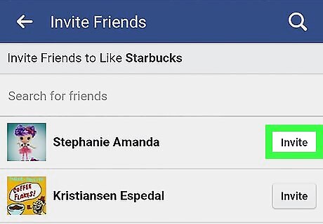 Tap the Invite button next to a friend's name. This will send your friend a notification saying you are inviting them to like this page. You will see a label indicating "Invitation Sent" below their name. You can use the Search field at the top of your screen to quickly find someone in your friends list.