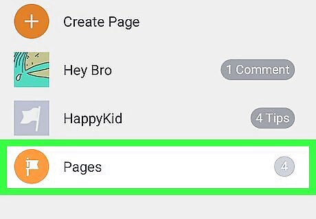 Scroll down and tap Pages. This option will be next to a white flag icon in an orange circle towards the middle of the menu.