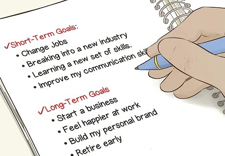 Make a short-term and long-term career plan. Searching for a new job is a big undertaking, so get the most out of it. Ask yourself about your current role and what you’re hoping to find in a new job. This could be the difference between staying in your current line of work and doing something completely different. Be as honest with yourself as possible. For example, ask yourself, “What do I like and dislike about my current job? What would I change about it?” Determine what your strengths, weaknesses, and skills are. These are all useful for advertising yourself to potential employers. Also, figure out if you’re happy in your current role and if it’s allowing you to reach your full potential. Hashing out a plan allows you to understand yourself better and come up with a clearer idea of what direction you want your career to go in. You may even decide you prefer staying in your current role or company. Making detailed career plans will help you to stay focused on your goals. Consider setting a 6-month plan covering what you need to do in the near-future and a 2 to 5 year plan for long-term goals.