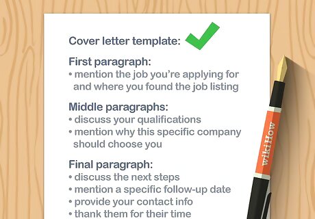Write a cover letter tailored to each position you apply for. A cover letter is the front page of your resume and introduces yourself and your qualifications. It is designed to make you look like a valuable job candidate. For that reason, read the job description for the position you are applying for and write a brief couple of paragraphs about why you want it. Use it to draw attention to the most important parts of your resume. Before you start the job search process in earnest, write up a sample cover letter. Tweak it over time to make it relevant for specific jobs. Having a basic template saves you time later on. While you can submit a generic cover letter to each job, that is boring. A good cover letter makes you stand out from other applicants and shows employers that you want to work for them.