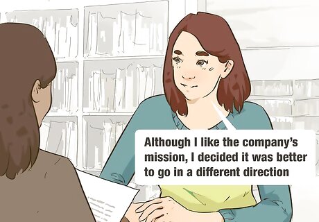 Come up with a good reason for leaving your current job. An interview isn’t a good place to air your dirty laundry. Potential employers are looking for positive, hard-working employees with a lot to offer. Simply tell them that you want to join a company that values your skills and will let you utilize them more fully. Avoid harshly criticizing your current job if you can help it. For example, if you don’t like your current boss, say, “Although I like the company’s mission, I decided it was better to go in a different direction.” It’s okay to say that you want new challenges to continue to grow. You could also point out that you were a bad fit for your old job. Try to point out your current job’s positive points so you don’t sound too grim.