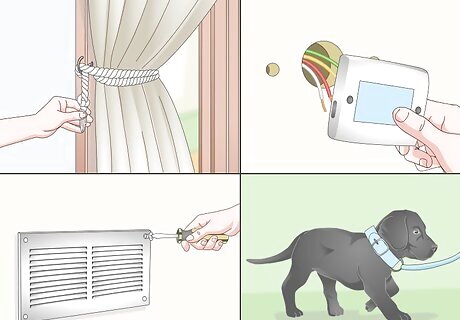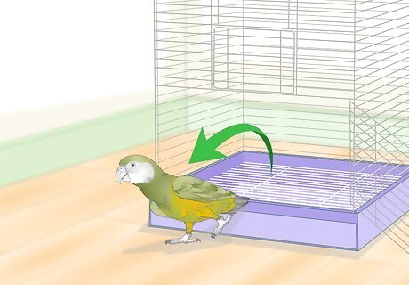 Bird proof your home. Before you take your parrot out of its cage, make sure that there are no dangerous objects or environmental hazards. Some ways to make your home safe include: Close the windows and cover them with blinds or drapes. Tie up curtain cords so that the parrot does not become tangled up. Hide or cover electrical cords, as the parrot might chew on them. Cover air ducts and small holes that your parrot could hide in. Remove other pets from the room. Keep the kitchen door closed. Cooking smells and pan fumes can cause respiratory problems for your parrot. Supervise your parrot constantly while it is out of its cage.