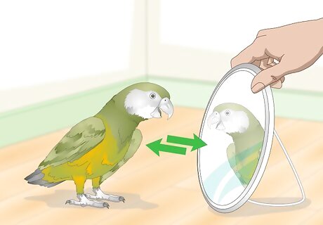 Consider adding a mirror. Some people advocate for placing a mirror in your parrot’s cage; others warn against it. Placing a mirror in your bird’s cage can definitely keep them entertained for hours, but it may cause problems later if you decide to introduce a second bird. Don't just place any mirror you find in the cage. Look for a mirrors designed for birds. Make sure the mirror is fixed to the cage and doesn’t present a risk to your bird.