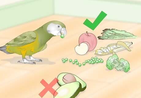 Offer a variety of foods. Another way to entertain and stimulate your bird is to offer a varied and interesting diet. The base of your bird’s diet should be specially formulated bird pellets, but you can provide some entertainment (and nutrition) by offering ¼ to ½ cup (59 to 118 ml) of varied fresh produce each day. Try offering: Beet greens Carrots Peas Corn Broccoli Sweet potatoes Apples Apricots Bananas Avoid avocado! All produce should be washed, peeled, and chopped/grated.