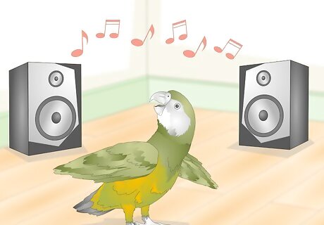 Turn on a radio. Parrots enjoy music as much as people do. Your parrot will also enjoy the sounds of people talking. If you are not going to be home for a little while, you might consider leaving the radio on for your bird.