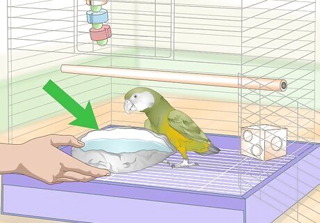 Include a bird bath. Parrots enjoy splashing and getting wet. You can help your bird stay entertained by providing a large, shallow dish of water. Include a small dish (or fountain-style dispenser) for drinking, to discourage your bird from drinking the bathwater. Change the bathwater and clean the bowls daily. To wash the bath, use warm, soapy water. Remove any soiled areas with a clean scrub brush. Dry the bowl with a towel before refilling it with water. Once a week, run the bird's water bowls through the dishwater with hot water. This will help sanitize the bath and prevent bacteria from growing.