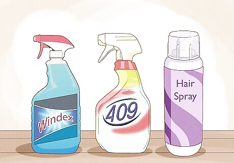 Choose from either chemical sprays, household cleaners, or hairspray. Chemical sprays kill flies instantly upon contact, though they contain harsh chemicals. You can also spray the flies with household cleaners, like Windex or Formula 409, or with an aerosol like hairspray. All of these sprays will help you kill a fly. Purchase chemical fly sprays at home supply stores. Look for brands like Hot Shot and Raid. Use spray if you want to remove many flies very quickly. Chemical sprays will kill them the fastest, though they have harmful chemicals. Household cleaners are a cheaper alternative, and you likely have them at home already.
