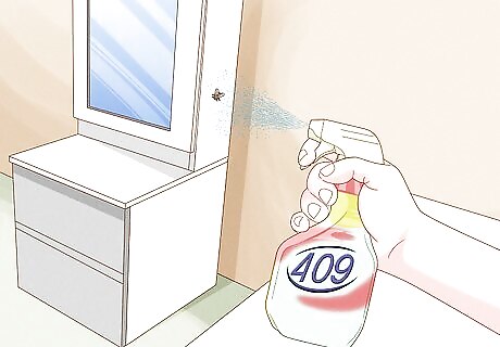 Spray the air near the fly thoroughly. Spray the fly while it is in the air or when the fly lands. Hold in the trigger to release the spray, and spray directly into the air around the fly. You want to saturate the fly in the spray. If you are using chemical sprays, the fly will die instantly. If you are using household cleaners or hairspray, the spray will coat the fly's wings, making it impossible to fly. The fly will still die, just not as quickly as with chemicals.