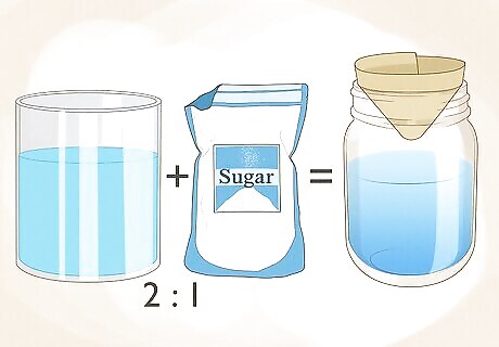 Make your own trap for a cost effective solution. You can make your own trap with sugar water, a jar, and a paper cone. Cut a small hole around the point of the paper cone. Pour 1 part sugar and 2 parts water into the jar, and place the cone upside down inside the jar. The flies will be attracted to the sweet smell, and once they are inside, they will get stuck and drown in the liquid. You can add a piece of cut fruit to the jar to tempt the flies further. Try a piece of apple or banana for fruit flies, raw potato for fungus gnats, and anything stinky for house flies. You can also add a mix of sugar and water to a plastic bottle instead of a jar.