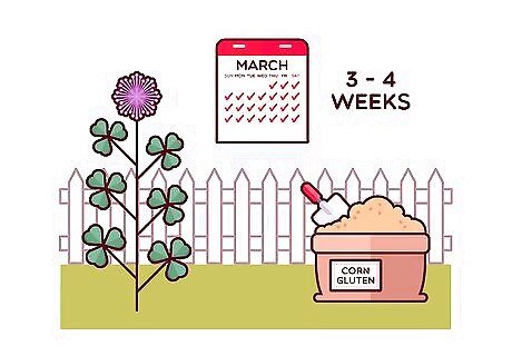 Use corn gluten on the clover. Corn gluten is a natural herbicide that can be used to kill clover. Look for powdered corn gluten that you can sprinkle onto the clover. Use 20 pounds (9.1 kg) of corn gluten per 1,000 square feet (93 m) of lawn. Water the corn gluten once you’ve applied it and then let the area dry for 2-3 days so the gluten can kill the clover. You can apply the corn gluten again after 4-6 weeks if the clover does not die.