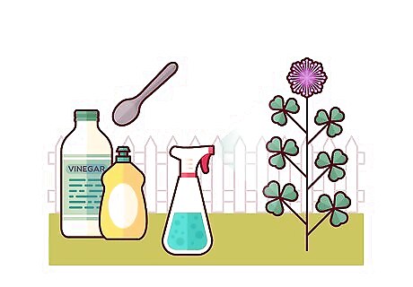 Spray the clover with a vinegar and soap mixture. Put 1 tablespoon (15 ml) white vinegar in a spray bottle with 1 tablespoon (15 ml) of dish soap and ⁄4 cup (180 ml) of water. Spray the clover with the mixture as a spot treatment to kill it. Avoid spraying the mixture on any surrounding plants or grass, as it can damage them.