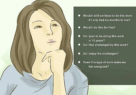 Ask yourself questions. Doing some thoughtful examination of your work and how you feel about it may help to make it easier for you to determine if you are passionate about it. If the answer to these questions is yes, then you may have found your passion. If it is no, then the work you are doing is probably not your passion. Some questions you might ask yourself include: Would I still continue to do this work if I only had six months to live? Would I do this for free? Do I plan to be doing this work in 10 years? Do I feel challenged by this work? Do I enjoy the challenges? Does this type of work make me feel energized?