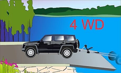 Slowly pull the vehicle out. Boat ramps can be slippery with moss and algae and it is important to not let the vehicle's tires spin. If your tow vehicle is equipped with four-wheel drive, this can be useful if your back tires start spinning. Once the boat is afloat and secured to the dock, drive the vehicle back up the ramp and park it at the landing, in the designated parking area.