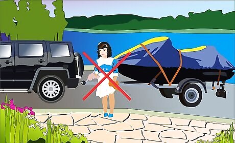 Make a plan together. If bringing along guests, brief them on where to go and what tasks to do. Be sure to let the guests in the boat first, along with the boat operator. That way nobody has to jump in after. If bringing along children, forbid young children and pets from playing or loitering on a boat launch ramp as this is a roadway that transitions into a waterway. Keep children and pets supervised by an adult in a different area than at the boat launch ramp. NEVER let children or pets play or be unattended at a boat launch ramp.