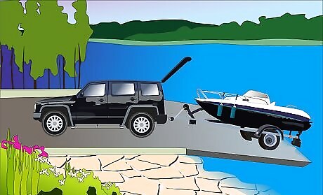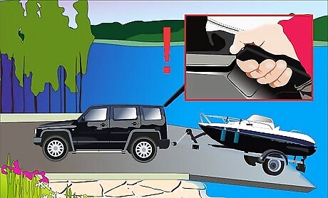 Back the trailer down the ramp. This is easiest done with two people: one driving and one as a spotter. With a truck or SUV it can be easier to see when backing up if you put the tailgate down or open the rear hatch/door/window. Drive slowly, making tiny fine-tune steering corrections as you go. How far to back the boat trailer into the water depends on many factors - type of trailer, depth of the water, type of boat, etc. A good rule of thumb is to back in until the water is just above the hubs on the trailer. Be careful about backing in too far otherwise the tow vehicle might become stuck. When backing down the ramp, have the vehicle in neutral. This makes it easier to control the vehicle quickly. If something fails, quickly put it in gear and go forward.
