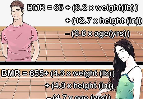 Calculate how many calories you can eat. In order to lose weight it helps to know your Basal Metabolic Rate (BMR). Your BMR tells you how many calories you burn a day just by being alive. It depends on your height, weight, age, and gender. Use a calculator online to find yours: http://www.bmi-calculator.net/bmr-calculator/ If you want to calculate your BMR by hand, the formula is as follows: For women: BMR = 655 + ( 4.35 x weight in pounds ) + ( 4.7 x height in inches ) - ( 4.7 x age in years ). For men: BMR = 66 + ( 6.23 x weight in pounds ) + ( 12.7 x height in inches ) - ( 6.8 x age in year ). This number varies widely by person. For example, a 50 year old woman who is 5 feet (1.5 m) tall and weighs 100 pounds (45 kg) only burns 1,137 calories by being alive. In contrast, a 20 year old man who is 6 feet (1.8 m) tall and 200 pounds (91 kg) burns 2,090 calories just by being alive.