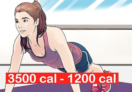 Calculate how many calories you need to lose weight. To lose weight, you must output more calories than you input. There are 3500 calories in a pound of fat so for every 3500 calories you net output, you lose 1 pound. Aim to reduce your current caloric intake by 500 calories a day, never allowing fewer than 1200 calories per day if you are a woman and 1500 calories a day if you are a man. You may choose to eat 250 calories less and burn 250 calories with exercise to meet this goal. Note that the less you weigh, the longer it will take to lose weight in a healthy way. Remain patient.