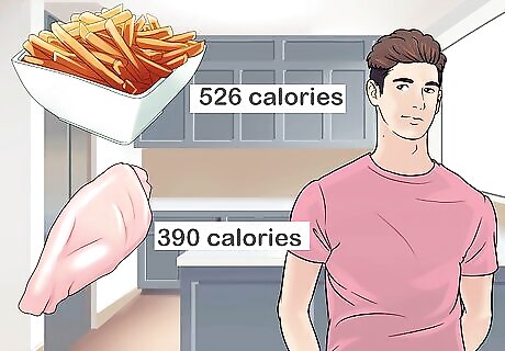 Make your calories count. Calorie counting is an important part of weight control but does nothing to help the body if the calories are of no nutritional value. Make your calories count by only eating nutritious foods — that way you can eat plenty while fueling your body with the nutrients it needs to stay healthy. For example, there are 526 calories in a small order (227 grams) of fries at a typical fast food place. 227 grams (8 oz) of chicken breast, however, is only 390 calories. Chicken breast is much higher in protein (over 35 grams higher), which will help keep your bones, muscles, cartilage, skin, and blood healthy and functioning. Many vitamins like Vitamin B, Iron, Vitamin C, and Magnesium are also found in foods high in protein. Often when people feel hungry it is because they aren't getting what they need nutritionally. Try making sure you are getting enough protein, carbohydrates, and healthy fat. The average healthy diet consists of 40% protein, 40% carbohydrates, and 20% fat.