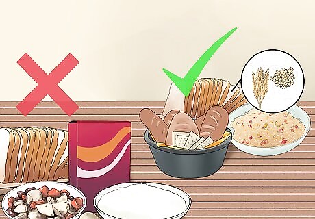 Learn the difference between good and bad carbohydrates. Low glycemic foods and foods high in fiber will help you feel full longer and prevent hunger because they are digested more slowly than refined grains and help keep your blood sugar even. Adversely, carbohydrates that are high in starch send signals to the body to store fat. High-starch (bad) carbs should be avoided as much as possible if you want to curb the spikes in your appetite. Instead of high-glycemic foods like white rice, instant oatmeal, cornflakes, white bread, baked potatoes, and corn, try lower-glycemic food like brown rice, steel-cut oat, bran flakes, and whole-grain bread.