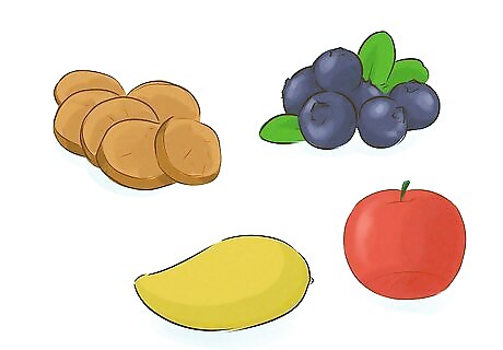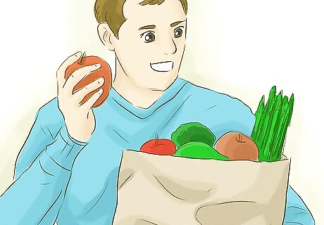 Shop for high-volume, low-calorie foods. Keep yourself feeling full by incorporating foods that have a low energy density, or fewer calories spread out over a higher volume of food. These foods will typically be higher in fiber and lower in fat, and can help you feel full longer by physically putting more food in your body without too many extra calories. Vegetables such as salad greens, broccoli, cauliflower, and asparagus are all low in calories relative to their volume. Use veggies as fillings, toppings, or as part of salad. Stick to fresh fruits. Fruit juices, dried fruits, and fruits packed in syrup typically have more concentrated sugars, and thus a higher energy density. Whole grains such as oats, quinoa, or brown rice are high in fiber as well as other important nutrients, and can help keep you full and healthy in moderation.
