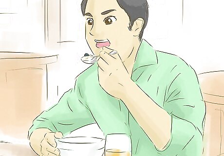 Try eating slowly. Slow eating doesn't work in all cases, but many people report feeling full after eating less when they focus on chewing slowly. This gives your body more time to allow your digestive hormones to interact with your brain, signaling that you're full before you take another bite. One trick to help you eat slower is to put your fork down between each bite of food. Do not pick it up again until you have fully chewed and swallowed the last bite. Another good trick is to take a drink of water between bites. This will also improve your digestion.