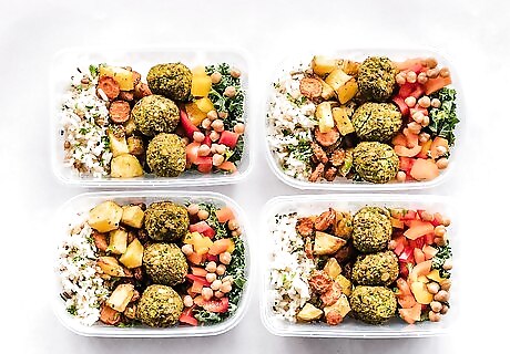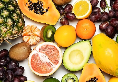 Eat a mix of starches, fruits and vegetables, proteins, and fats. The more balanced your diet is, the better your blood sugar levels will regulate. Try to eat 3 meals a day with a mixture of every food group, including: Vegetables: broccoli, carrots, greens, peppers, and tomatoes. Fruits: oranges, melon, berries, apples, bananas, and grapes. Whole grains: wheat, rice, oats, cornmeal, barley, and quinoa. Lean protein: chicken, turkey, fish, eggs, nuts, and dried beans. Dairy: milk, yogurt, and cheese.