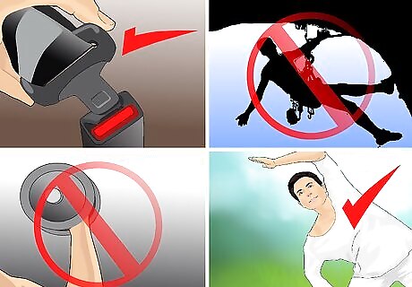 Limit your risk of injury. While you cannot prevent all injuries, you can take some simple steps to reduce your chances of some common injuries. Always wear a seat belt when in a car and a helmet if you are riding a bicycle, rollerblading, or playing a contact sport. Take it slow at the gym and make sure that you understand the proper technique for all new exercises you try. Stretch your muscles before exercising. Avoid risky activities, like rock climbing or downhill skiing, that might lead to an injury.