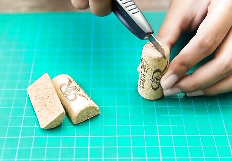 Slice each cork in half, lengthwise. Be especially careful not to slice your fingers when doing this. It helps to wear work gloves during this part of the process and lay down a non-slip surface for the cutting board to sit on, such as a silicon map, before beginning. Take plenty of breaks, as there are a lot of corks to get through––grab a friend to help if possible. To slice the corks in half: Stand the cork up on the cutting board or cardboard, then cut downward. Hold the top of the cork with your finger and slice it neatly in half. Sand the sides of the cork if they become too jagged. Gently run the sandpaper down the sides and along the middle to ensure a smooth, clean surface.