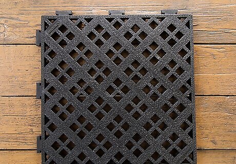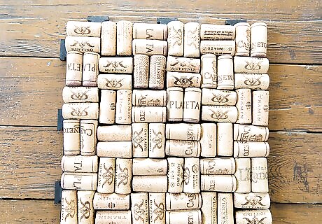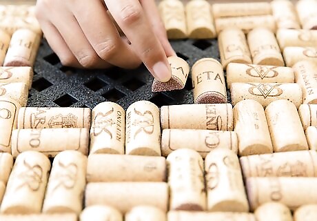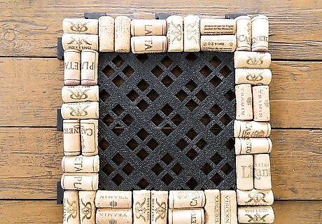 Arrange the cork halves around the perimeter of the line or mat. Begin by creating a border with cork halves lining up vertically along the edges of the mat: Line the corks up so the bottom of each cork (end) butts up to the sides of the mat or liner. Complete the entire perimeter of the mat with corks until the entire mat/liner has been lined with corks. If you don’t achieve a perfect fit, cut some of the corks to fit. Apply hot glue to the flat half of each cork and press the cork into the liner or mat. Use a dab of glue at the top and bottom of each cork and press firmly into the mat. Use a rag to wipe any excess glue that may ooze out from beneath the corks.