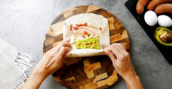 Roll the burrito. First, fold the wide sides of the tortilla inward. Then, roll up the burrito from the bottom. This should "seal" both ends for easy eating. Consider grilling the burrito. For a tasty twist, plop the rolled burrito back onto a pan or grill to char the sides. Grill on a high heat for 20-60 seconds until the tortilla firms up and grill marks appear.