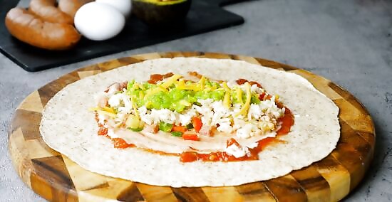 Heap the fillings onto the tortilla. Add the egg, the veggies, the meat, the rice, the beans, the avocado – whatever you've prepared. Make sure not to make the burrito so full that you cannot fold it shut! Arrange the ingredients in a thin line across the center of the tortilla, leaving at least two inches on each side and at least an inch at each end.