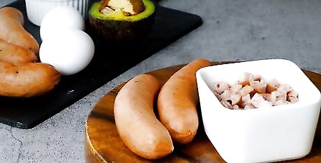 Include meat. If you eat meat, use the meat of your choice to lend some heft to the burrito. For a classic breakfast burrito, use traditional "breakfast" meats like sausage, bacon, ham, or chorizo. Feel free to use any other meat (chicken, steak, turkey, etc.) that you have on hand. Cook the meat with the vegetables, unless you are making multiple burritos for both vegetarians and meat-eaters. In this case, keep the ingredients separate.
