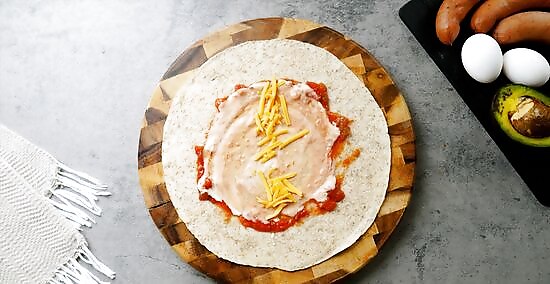 Add toppings. If you haven't added toppings yet, put them on top. Sprinkle cheese onto the mount of ingredients. Load sour cream or salsa along the line. This can be a fun way to spice up your breakfast burrito.