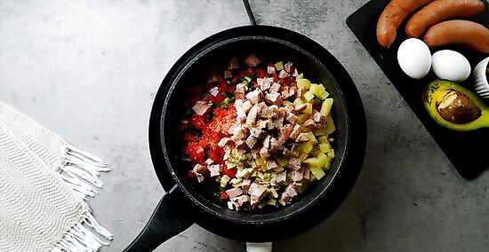 Cook in sequence. Bear in mind that some ingredients will take longer to cook than others. Start rice first, and then start cooking the potatoes and beans. Next, cook any raw meat, unless you are using pre-cured ham, sausage, or bacon. Grill peppers, onions, tomatoes, mushrooms, and other easy-to-cook vegetables at the same time. Start the eggs last – they'll be quick. If you are using pre-cooked or pre-cured meats, then you can simply grill them together with the diced vegetables. Quick-to-cook meats might include sausage, ham, and bacon.