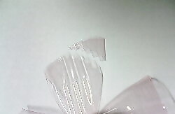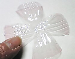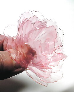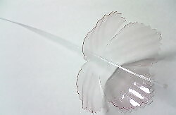 Pet_778.jpg Cut a plastic bottle into the shape shown. Use the plastic bottle to hold and shape each layer of petals with heat from a hair dryer or heat gun.