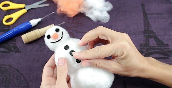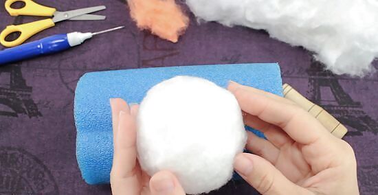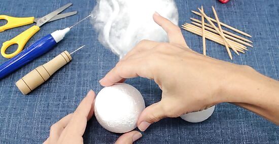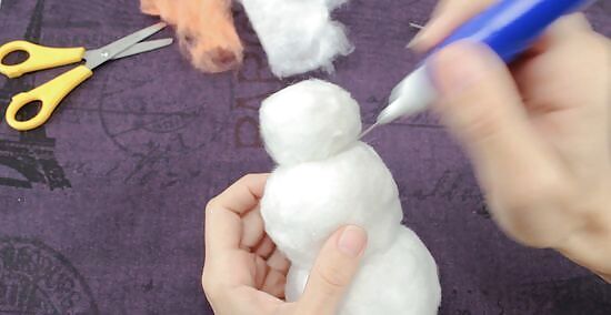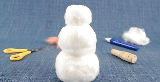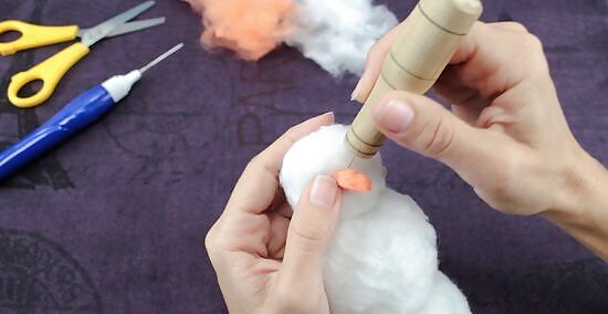 Wrap a piece of wool roving around the snowman, then poke it into the Styrofoam balls using a felting needle. Pull a tuft of wool roving, and wrap it around the Styrofoam. Poke your felting needle up and down against it and into the Styrofoam ball. Keep doing this in various places until the wool stick. When you get to the seam between the two balls, wrap a tuft of wool around the neck, then poke the needle into the balls themselves, and not the space between them. Use as many tufts and layers of wool roving as you need to in order to cover up the Styrofoam.