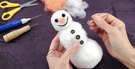 Add some eyes and buttons using small tufts of black wool roving. Pull off a small tuft of black wool roving. Roll it into a ball, then place the ball against the snowman's face. Poke the needle repeatedly through it until it sticks. Do this for the other eye and buttons. You will need two to three "buttons" on the middle ball. Alternatively, you can glue tiny, doll-sized black buttons to the snowman to make the eyes and buttons.