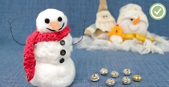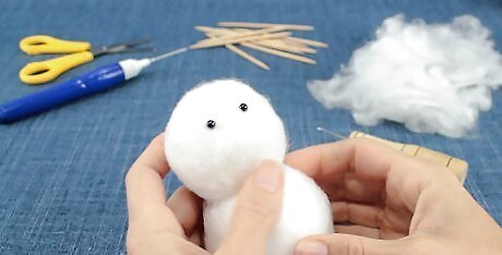 Glue small, black gems to the snowman to make the eyes and buttons. Get a sheet of small, black, self-adhesive gems from the scrapbooking section of your arts and crafts store. Attach two gems to the small ball using hot glue to make the eyes. Attach three gems to the bigger ball to make the buttons. If you can't find any hot glue, use fabric glue or tacky glue instead. Don't rely on the adhesive that's already on the back of the gems; it's not strong enough. If you'd like, you can attach four to five gems to the small ball to make the mouth. Can't find any black gems? Try black, mini, doll-sized buttons instead.