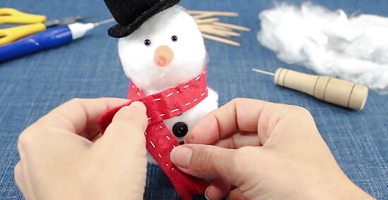 Make the scarf out of a thin strip of red craft felt. Cut a thin strip out of red craft felt, long enough to wrap around the snowman's neck. Cut a short fringe into both of the narrow ends. Wrap the scarf around the snowman's neck, and secure it with a loose knot or a drop of glue. Make the scarf fancier by embroidering the edges with white embroidery thread and a running stitch.