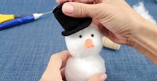 Make a top hat out of a sheet of black craft felt. Cut a rectangle out of black felt, roll it into a tube, and secure it with hot glue. Cut a small circle out of black felt, glue it to one end of the tube, and cut off any overhang. Cut a larger circle out of black felt, and glue it to the other end of the tube; do not cut off any overhang. When you are done, glue the hat to the top of the snowman's head. Consider stuffing the tube with polyester stuffing before gluing the bigger circle. This will make the hat more stable.
