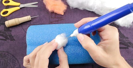 Poke the ball with a size 36 felting needle until it holds its shape. Hold the loose end in place as you poke the ball with the felting needle. Keep poking the wool until a firm ball starts to form.
