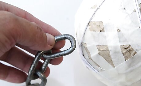 Attach the chain. If you are using plastic chain, thread each wrap of the string through the link as shown. Every wrap should go through the chain. This is both for strength and for safety. If you are not using a chain, then create a hoop with these string lengths. This way you can run another series of strings through it and attach them to the handle of the flail.